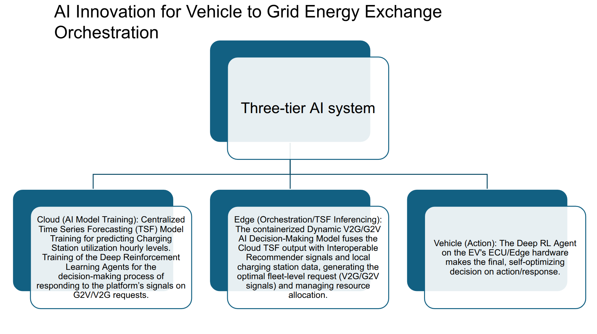 Our core innovation is a Cloud-Edge AI framework that leverages Time Series Forecasting (TSF) to predict grid under/over-utilization periods. By integrating this real-time grid forecast with contextual vehicle data (EV location, State of Charge – SoC, and proximity to V2G charging stations), the system dynamically schedules Vehicle-to-Grid (V2G) discharge events during peak grid stress and Grid-to-Vehicle (G2V) charging during off-peak times.